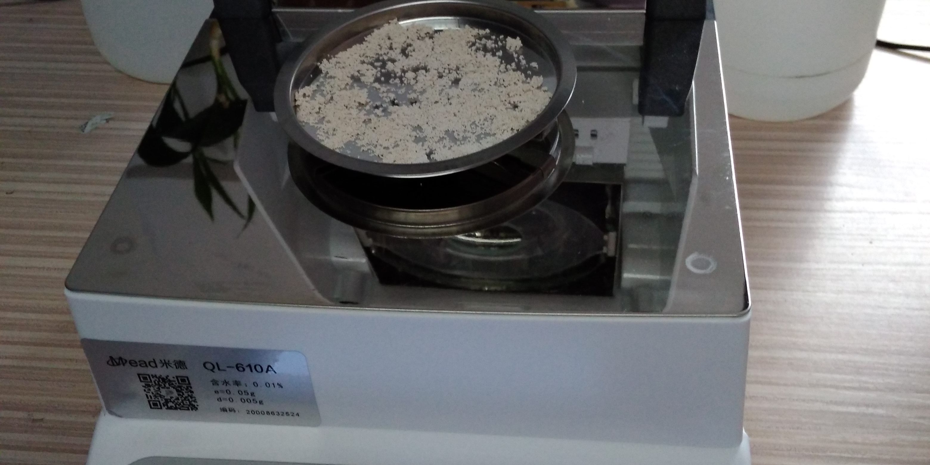 - 測試樹脂顆粒:倒出4克左右樹脂料顆粒倒在不銹鋼托盤中,為了使測試過程中樹脂水分儀將樹脂料烘干烘透,我們將樹脂顆粒攤成分散狀,以便溫度能滲透進(jìn)樹脂內(nèi)部。用鑷子將樹脂顆粒平鋪均勻,為避免樹脂顆粒烘烤后變焦變黑,我們將溫度設(shè)置在105℃,按“START”鍵開始測試,15分07秒后檢測結(jié)束,檢測數(shù)據(jù)顯示56.57%;
